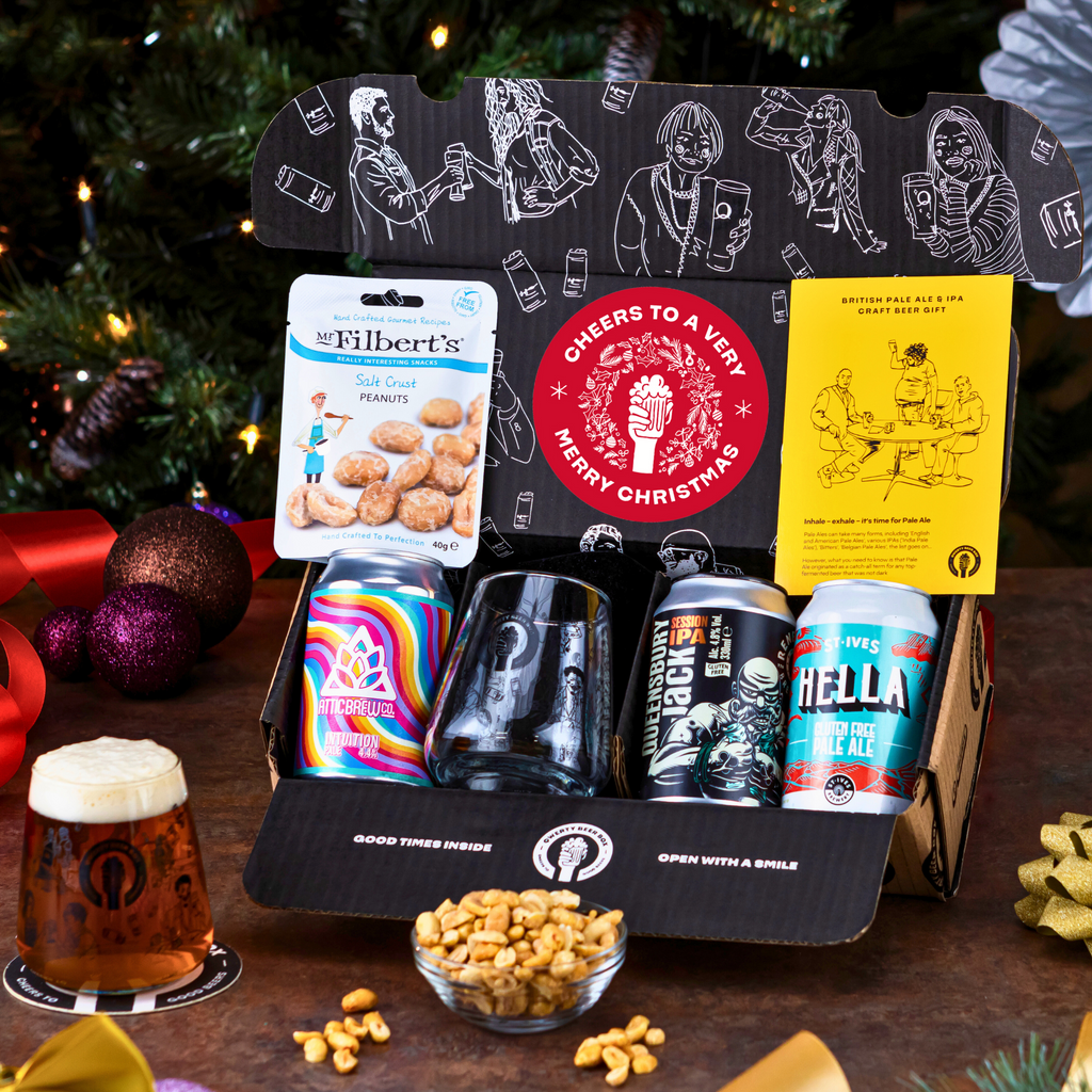 Premium Merry Christmas Craft Beer Gift Pack - 3x330ml Craft Beer Cans Including IPA and other Pale Ales, Bespoke Branded Glass and Delicious Mr.Filberts Snack - Craft Beers Tasting Experience with Tasting Notes