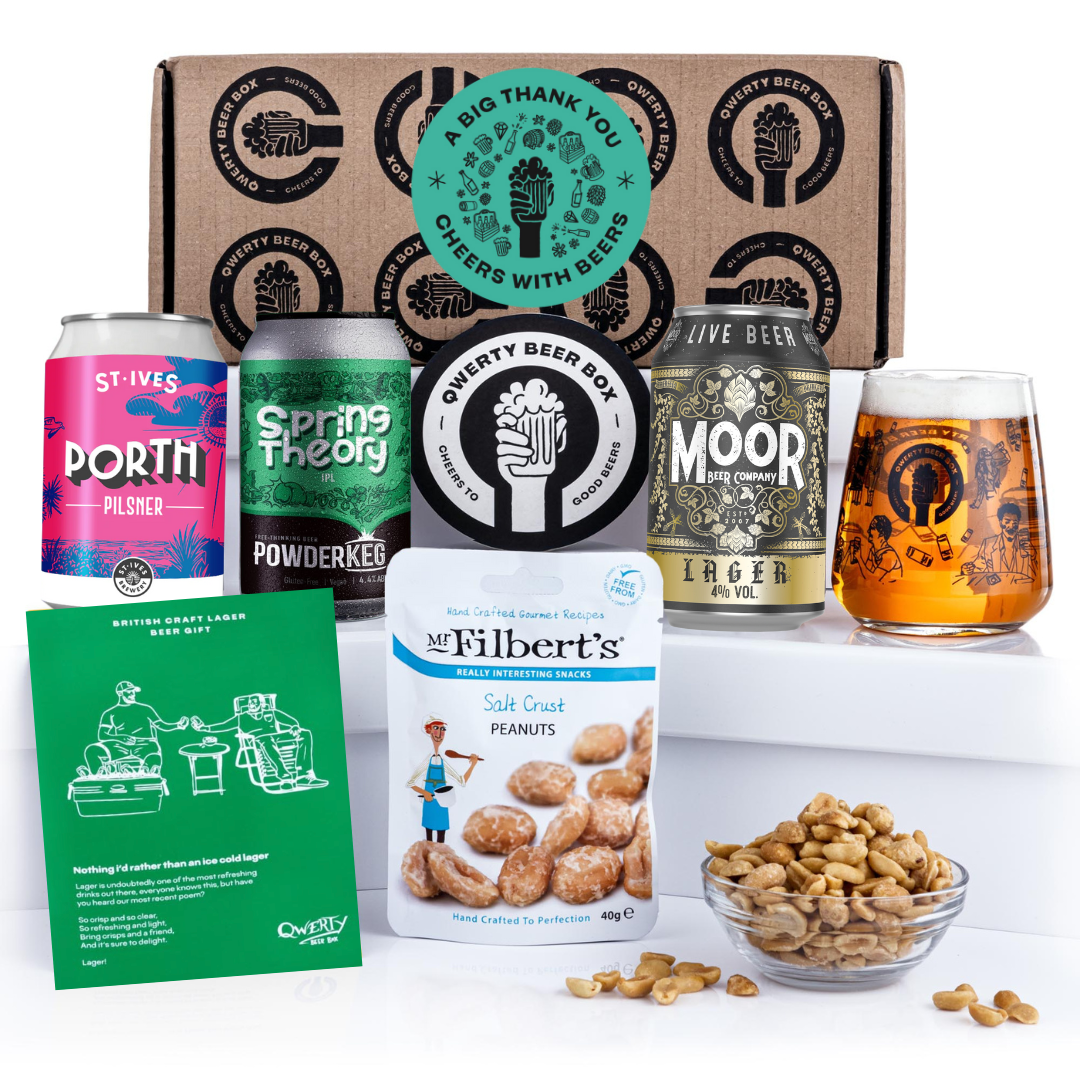 🇬🇧GREAT BRITISH LAGER GIFT for craft lager lovers, 3 cracking independent British Lagers, premium salted Mr.Filbert's nuts, bespoke beer glass and tasting notes